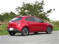 サスペンション形式は、フロントがマクファーソンストラット、リアがトーションビームで、リアの形式がアクセラ以上の車種とは異なります。そのあたりが関係しているのか、乗り心地は低速では固めです。しかし50km/hぐらい出すと固さが気にならなくなります。シートの座り心地の良さを含めて、ヨーロッパ車を思わせるチューニングでした。