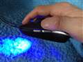 形状としては特に変わり映えしない。だが、ホイール左横の”BLUE LED SENSOR”のロゴが以外に恰好いい(写真:センサー部アップ)。