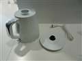 - 磁器のような質感の電気ケトル。容量1.0Lで、本体の重量は片手で持てる約675g。