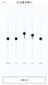 低音たっぷりで暖色系。それだけでは音が曇るので6k〜10kに山を作った明瞭感は前作同様。歌モノではボーカルの芯が欲しいのでアプリのイコライザーで補正しようと思ったら「あ、400hz以下の低音域のバンドがない」と気づき、図のようなセットで低中高のバランスを整えました。