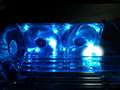 【デザイン 】クリアボディにスカイブルーLEDですので、光がファン全体に行きわたります。クーラーマスターのブルーLEDファンと共に使ってますが、それよりは若干光が明るめですね。ですが、さほど色の違いは気になりません。