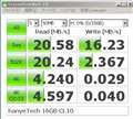 CDMの測定では順書込が、トランセンド等より3MB/s程高スコアだったのにも関わらず、実際の撮影では内部メモリ消費後、書込が間に合わず秒間0枚という時がありカメラ撮影には向かないと思われる結果になりました。
