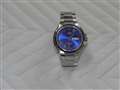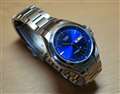 細かなサテン仕上げのブルーの文字盤が美しい。光源や光源との位置関係によって色が写真のような明るく輝くブルーから濃い群青色の間で変化して見えます。