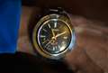 サファイヤガラスのベゼルは、明るいところでは黒く見えるが、室内など明るくなければ白っぽくすりガラスのように見えて、得体のしれない様相を帯びる。金色はさほど目立たない。