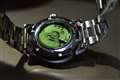 黒い文字盤に白い長針、短針は針の形が切り抜かれた黒い円盤が回転するようになっており、色分けされたインデックスと同色の下地が時間ごとに切り抜き部から見える構造。なので、時間ごとに短針の色が変わって見えるのが特徴。シースルーバックの裏蓋ガラスはややグリーンがかった色。
