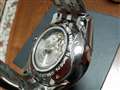文字盤沢山についた突起の影響で見る角度によって黒からグレーに変わる その上にシャープな銀色の3連ダイアルが浮き出しとっても精悍な印象