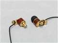 【デザイン】外観。木目調のプラグ周辺からゴールドを縁取られたイヤーパッド付近は嫌味にあるいは下品に野卑にならない範囲でバランスが配慮されており、私は徒歩移動の際音楽を聴きませんがこのイヤフォンで街中の誰かが音楽を聴いていたらなかなか良いセンスだと思うでしょう。