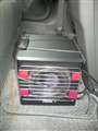 車内後席フロア中央に設置、コーン紙保護のため料理用トレー流用でグリルガードを自作 |