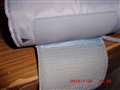 老人などで痩せて細い腕の人は、カフの内側の抗菌処理されている柔らかい水色の布の部分が、矢印マークの付いているマジックテープ(オス部分)に接着し、水色の布が毛羽立って破れる可能性がある。