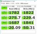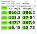 添付画像の通りです。書き込みが公称値より低い気がするのですが、システムドライブとして3か月使用後の測定値だし、誤差もあるでしょうから、公称値の85%というのはまあ許容範囲と思うべきかもしれません。