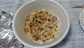 とかやく入り粉末スープを投入し熱湯を注ぎます。 |