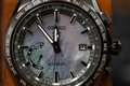 まず何よりすばらしいのが、文字盤。ダークマザーオブパール製で、見る角度により表情が変わり大変美しいです。