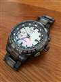 天然の白蝶貝に黒色の塗装を施したダイアルはとても上品で美しい。水面の煌めきを思いおこさせるような色合い。ベゼル、ブレスを含めて黒とグレーで統一したのが良かった。スイス時計の模倣から脱することができた稀有なデザイン。ちょっとレトロな竜頭も良いアクセントとなっている。