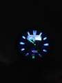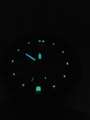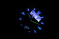 サファイヤグラスを通し、文字盤が浮き上がるような青色のライティングで夜間での視認性も向上している