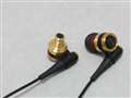 【デザイン】エレコム のCH-1000,2000ハイレゾイヤホンの共通デザイン、金の縁取りの丸いドライバ部と直角に出るケーブル部。ケーブル被覆やコネクタ部が改善され、耐久性が上がった。黒・赤ケーブルモデルがある。