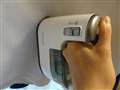 衣類スチーマーの使用イメージ。ボタンを押し続けなければならないのは少々辛い |