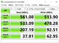 公称値:読込速度 560 MB/s・書込速度 530 MB/sに対し実測値:.画像1のとおりなので速度的には十分だが、MLCタイプの860 PROはV-NAND 3bit MLC=TLCの860 EVOと違い疑似SLCを使った「インテリジェントターボライトテクノロジー」が実装されていないのでランダムの書き込みの実測数値は下位モデルのEVOの方が速いく逆転現象が起きているが、大容量のデータを連続して書き込む場合には当機のほうが速度が安定している。