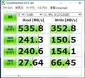 CrystalDiskMarkで測ると、530MB/s以上出ていました(デフォルト設定で5回測定)。1回目の結果をアップします。