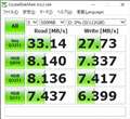 読込み、書込みともにベンチマークのみならず、体感的にもまったくストレスを感じない速度です。CrystalDiskMarkの測定でも