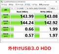 USB3.0の外付けHDDの速度は画像の通りです。SSDは内蔵SATA接続ほどの速度は出ないかもしれませんが、USB2.0よりは遥かに高速かと思います。