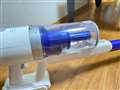 トリガー型のハンドルを装備し、その上にモーターとサイクロン部分、ダストボックスを配置。スティック掃除機等のレイアウトは一般的なもの。ブルーのパイプが特徴的でホワイトのボディとの相性はいい。デザイン的には好印象だが実際に手にしてみるとプラスチックによるチープさがやや気になった。