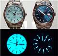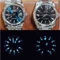 蛍光はOmegaのアクアテラと性能の違いはそうないようでどちらも早朝まで時刻が分かりました。似たデザインの36mmフルーティッドベゼルのTIMEX(tw2v66500)と並べると昼間は圧勝ですが、夜はTIMEXはインディグロライトが光って透明感のある文字盤が楽しめ負けるかも(写真)。