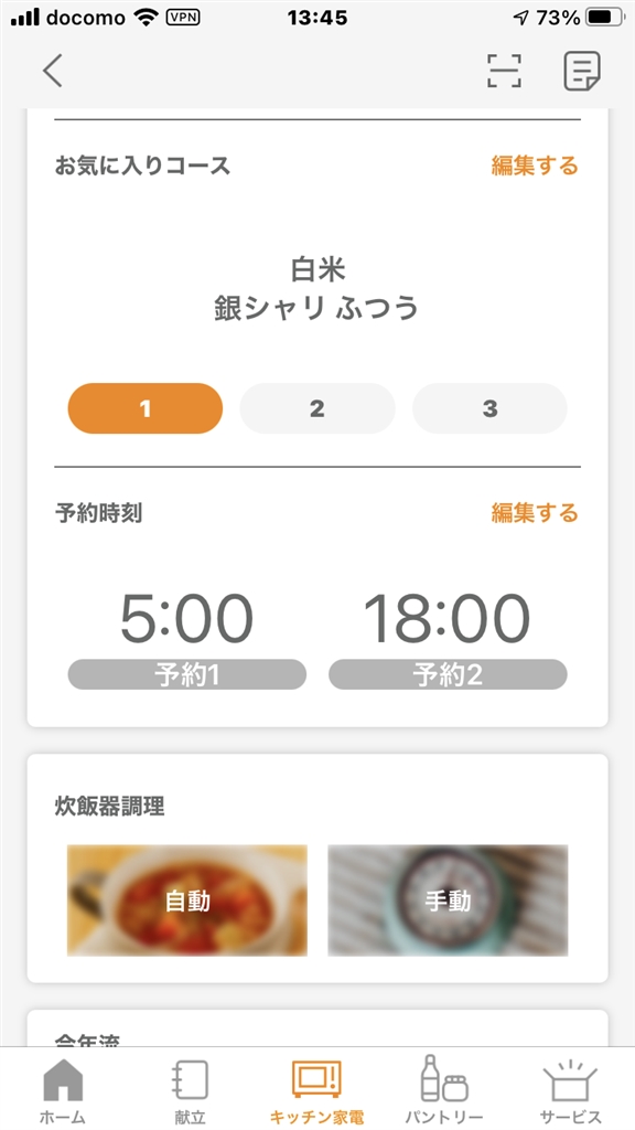 炊飯の設定画面。調理は下に位置し、「自動」「手動」を選ぶ。