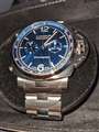 パネライのルミノールの形を残しつつ、クロノグラフの機能をきれいに収めている。文字盤も美しく、視認性も良い。2層式のサンドイッチ構造で夜間の文字盤はとてもきれいに光る。パネライらしい44ミリのケースサイズで、カジュアルとスポーティーを両立させた名作。現在パネライのクロノグラフでは唯一のブレスレットモデル。