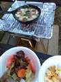 肉を焼く前にスキレットでアヒージョ。ヨゴレ防止のアルミの威力大。 |