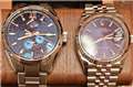 ●青系文字版と比較:魚のうろこ?のようなもこもこした型打ちは若干趣味が分かれるかも。天空よりも清い水が湧き出ている涼やかな感じかなぁ。ROLEX,CITIZEN,SEIKO,青メテオ(RENAUTUS)の青文字盤と比較しました(写真)。この時計では反射光での画像(ランプなど)が青くなっているのが特徴。ともかく透明感が半端なくとても深い明るいブルー!です。反射のない状態でのROLEXとの比較では勝ちかも。パワーリザーブは裏から見る設計にして欲しかったです。ただパワーリザーブの基盤も反射画像が青色で見えるので普通の塗装でないようで技術的評価対象になります。サンレイ的な文字盤でこの透明な手法が有効か知りたいところです。