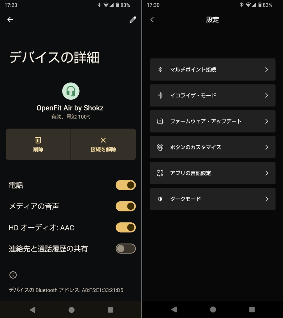 『OpenFit Airの接続状態とアプリの設定一覧』Shokz OpenFit Air SKZ-EP-000026 [ホワイト] sumi_hobbyさんのレビュー・評価画像1/1